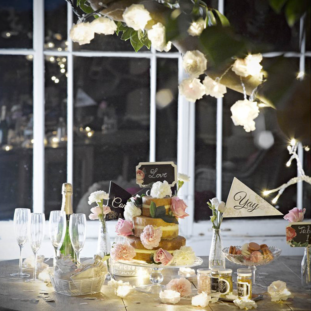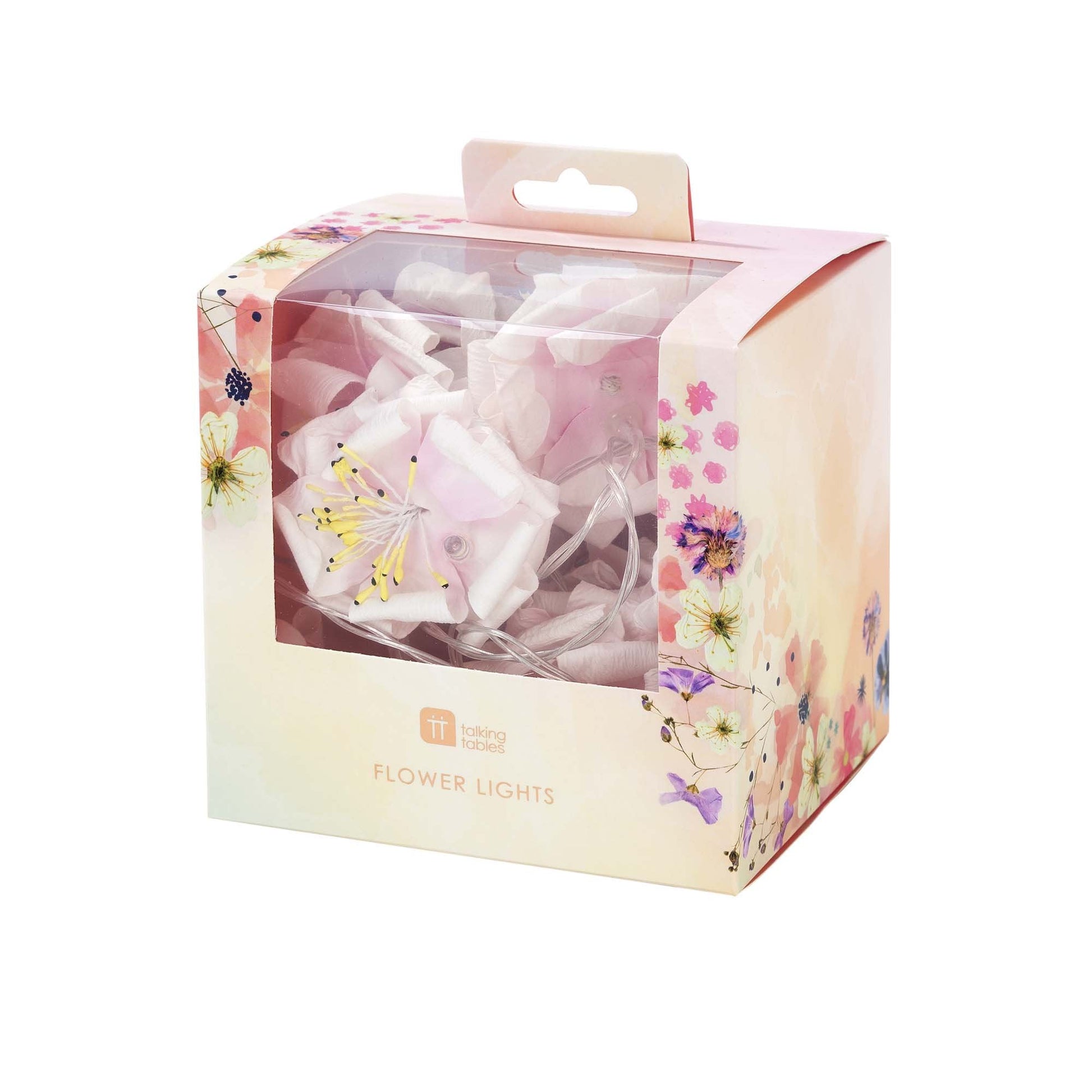 Bonita y delicada guirnalda de flores con luces para conseguir el toque cálido en la mesa. Puedes ponerla como centro de mesa recorriendo el largo de la mesa colgarla a modo de guirnalda. El efecto que conseguirás es total y le darás el toque cálido y acogedor a tu celebración especial.