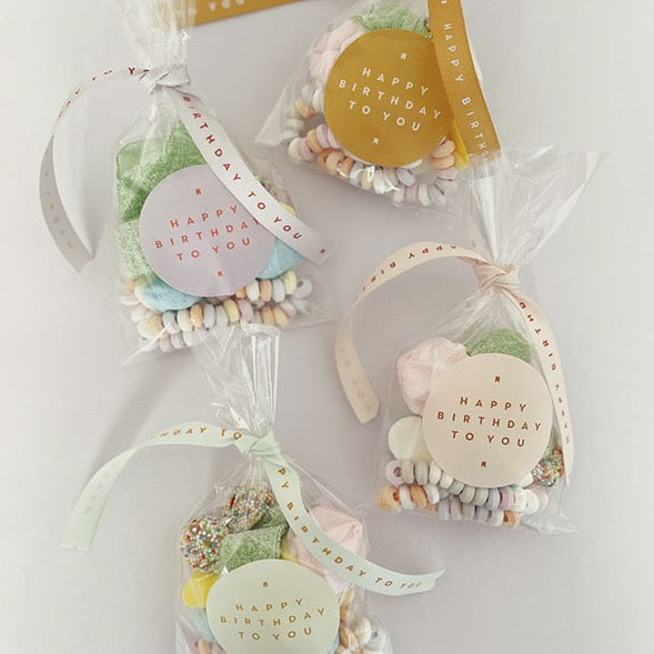Las bolsitas de golosinas son un clásico, pero estas son las bolsitas más cool y Chic que has visto jamás. La cantidad de golosina es perfecta y son súper decorativas. Llevan una pegatina de Happy Birthday to you en letra roja sobre fondo en un bonito color pastel y van a juego con la cinta que las cierra. Son ideales para regalar.