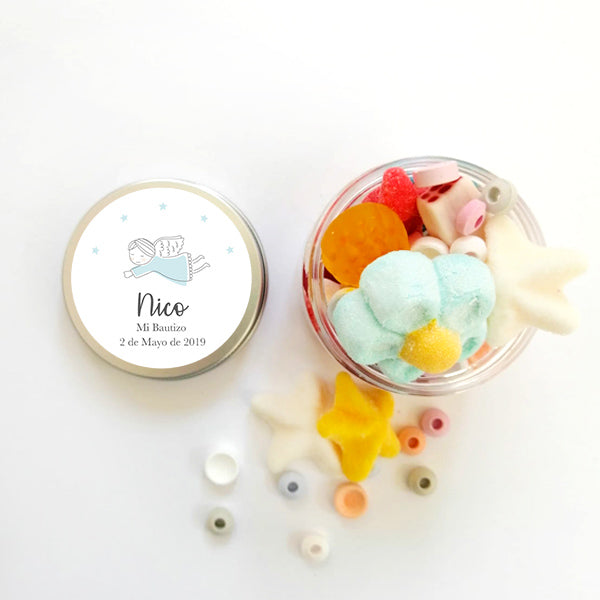 Regala a tus invitados de tu fiesta estos botes de chuches personalizados con el texto que tu elijas.