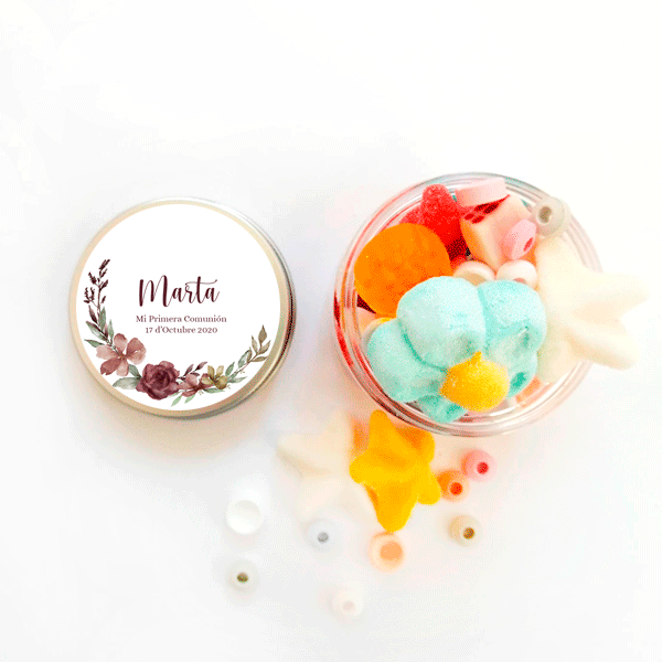 Regala a tus invitados de tu fiesta estos botes decorados con una etiqueta personalizada con el texto que tu elijas.