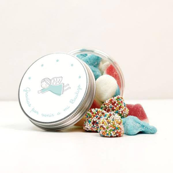 Regala a tus invitados de tu bautizo estos botes decorados. Son ideales para poner en cada sitio en la mesa, regalar a tus invitados de recuerdo o en tu Candy Bar. Cada bote de plástico grueso tiene una tapa de aluminio y puedes elegir si los quieres rellenos de golosinas para poner dentro lo que quieras.
