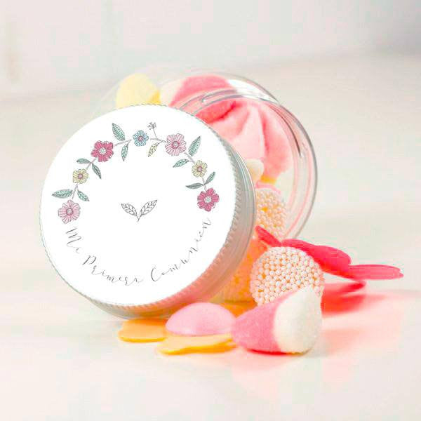 Regala a tus invitados de tu comunión estos botes decorados. Son ideales para poner en cada sitio en la mesa, regalar a tus invitados de recuerdo o en tu Candy Bar. Cada bote de plástico grueso tiene una tapa de aluminio y puedes elegir si los quieres rellenos de golosinas para poner dentro lo que quieras.