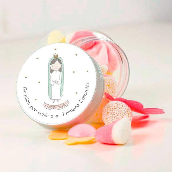 Regala a tus invitados de tu comunión estos botes decorados. Son ideales para poner en cada sitio en la mesa, regalar a tus invitados de recuerdo o en tu Candy Bar. Cada bote de plástico grueso tiene una tapa de aluminio y puedes elegir si los quieres rellenos de golosinas para poner dentro lo que quieras.