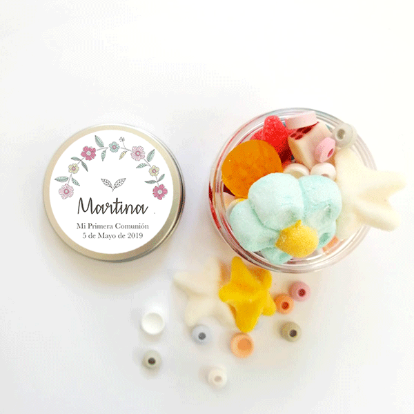 Regala a tus invitados de tu fiesta estos botes de chuches personalizados con el texto que tu elijas.