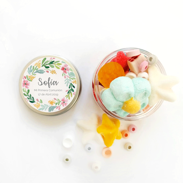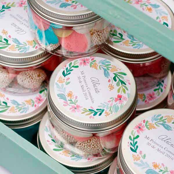 Regala a tus invitados de tu fiesta estos botes de chuches personalizados con el texto que tu elijas.