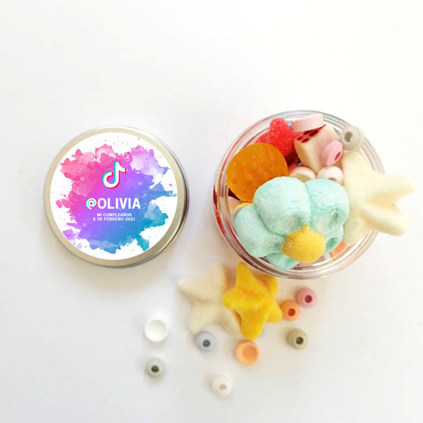 Regala a tus invitados de tu fiesta estos botes de chuches personalizados con el texto que tu elijas.
