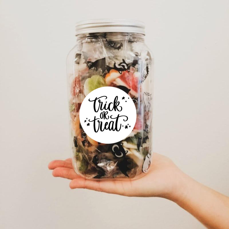 Recibirás un espectacular bote decorado con etiqueta truco o trato con capacidad 1,5 lts. de plástico grueso brillo con tapa de aluminio con 12 bolsitas individuales con golosinas de halloween de fabricación española de la mejor calidad.