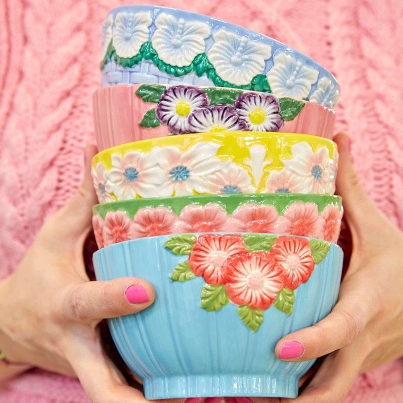 Divertido y colorido bol de cerámica en color amarillo y rosa brillante con flores blancas y detalles celeste. Conseguirá un toque único y muy especial en tu cocina. Puedes combinar diferentes modelos y estampados para darle un toque muy Kitsch a tu hogar. ¡A nosotras nos encantan!