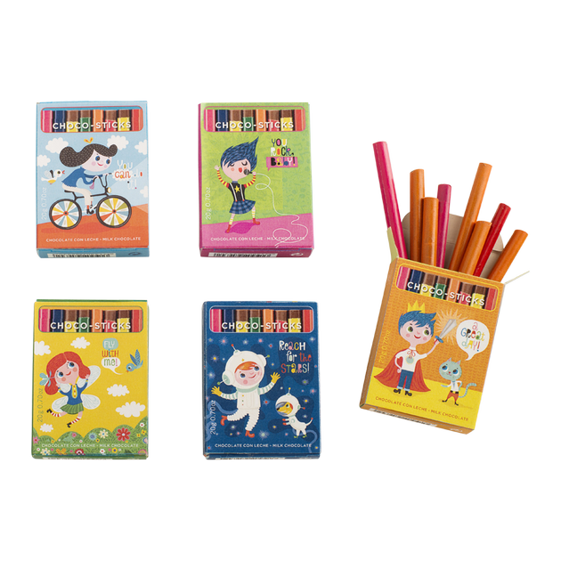 Barritas de chocolate con leche dentro de cajitas, con diseños divertidos para los más pequeños de casa. Ideales para proporcionar pequeñas porciones de chocolate a tus hijos o colocar dentro de los Calendario de Adviento.