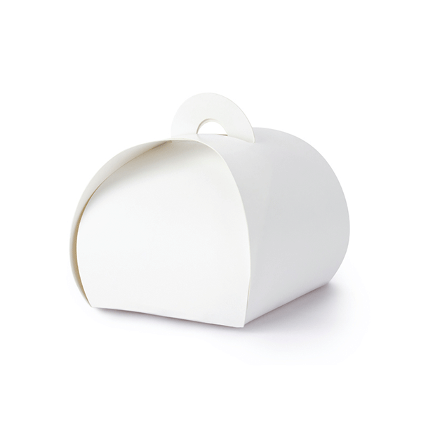 Cajita de base cuadrada y abombada con asa. Hecha de cartón blanco, es ideal para presentar un detalle para regalar en tu boda o fiesta.