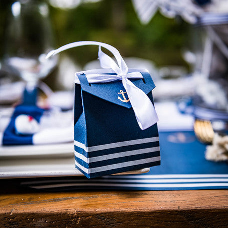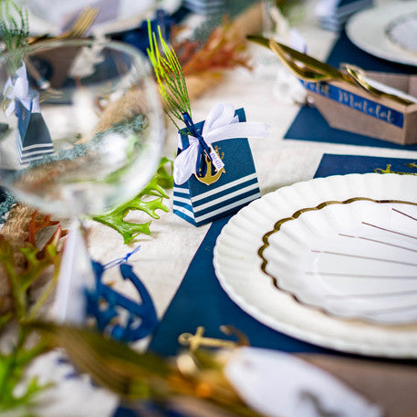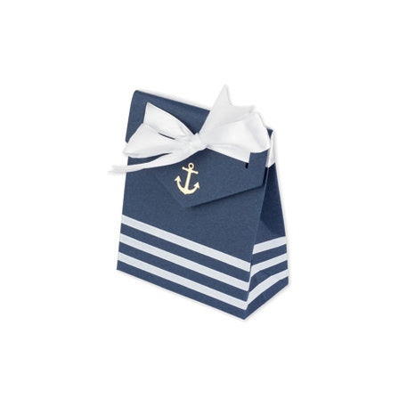 Esta cajita rectangular cartón azul marinero con rayas blancas y detalle de ancla en dorado, es elegante, un básico ideal para decorar y presentar un detalle para regalar en una Primera Comunión o para rellenas con chocolates o lo que quieras en cualquier fiesta. Se cierran con un lazo blanco satinado.