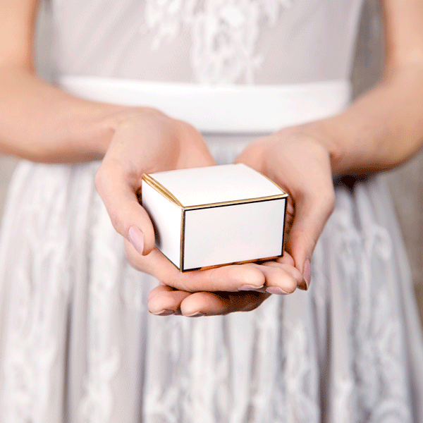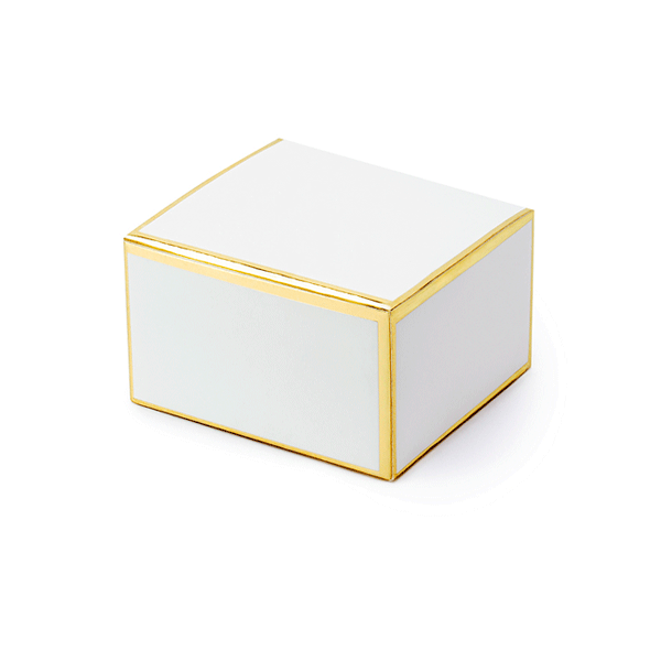 Esta cajita rectangular cartón blanca con detalles en ribetes dorados. Es elegante, un básico ideal para decorar y presentar un detalle para regalar en tu boda o para rellenas con chocolates o lo que quieras en cualquier fiesta.