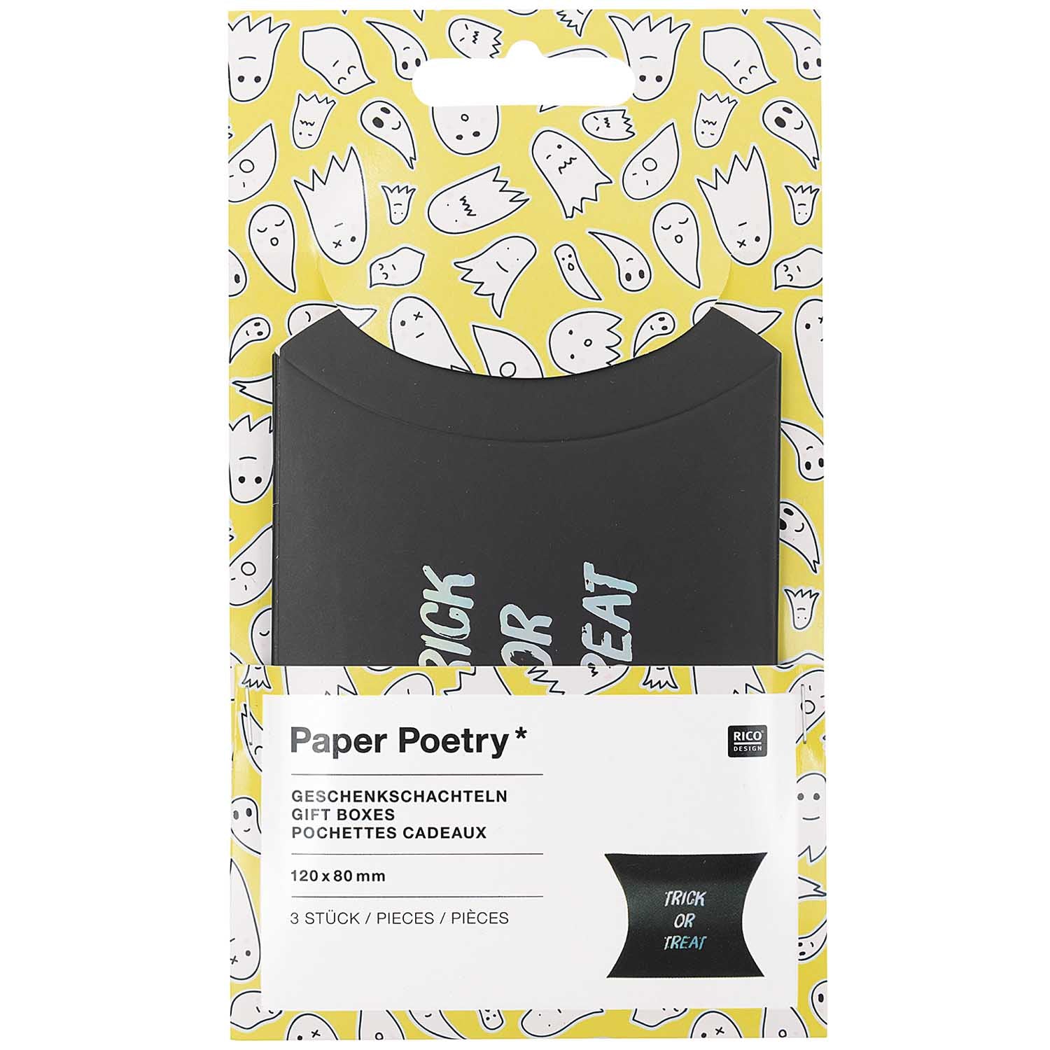 Mini cajitas de cartón perfectas para rellenar de golosinas para Halloween. Tienen un bonito "Trick or Treat" en acabado iridiscente sobre un fondo negro. Son perfecta para envolver un pequeño y aterrador regalito.