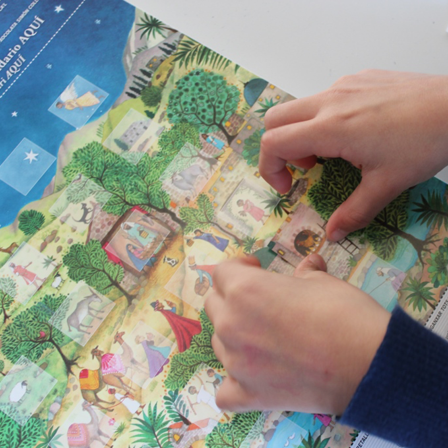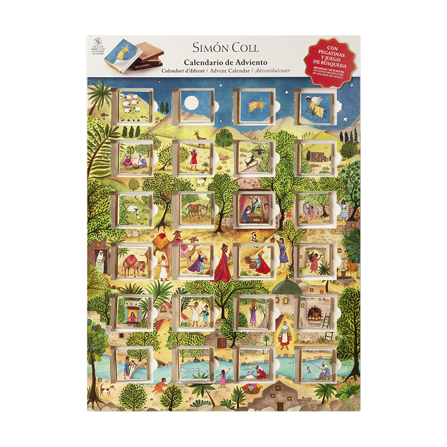 Calendario de Adviento compuesto por 24 chocolatinas con ilustración del portal de Belén. Cada pieza de chocolate con leche contiene una pegatina que irá completando el dibujo del dorso del calendario y un juego de busqueda. Ideal para hacer más dulce y divertida la espera de la Navidad