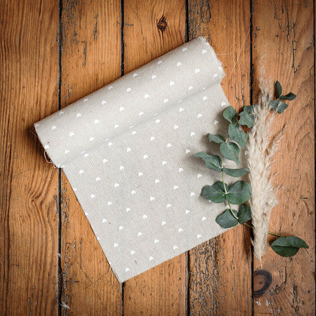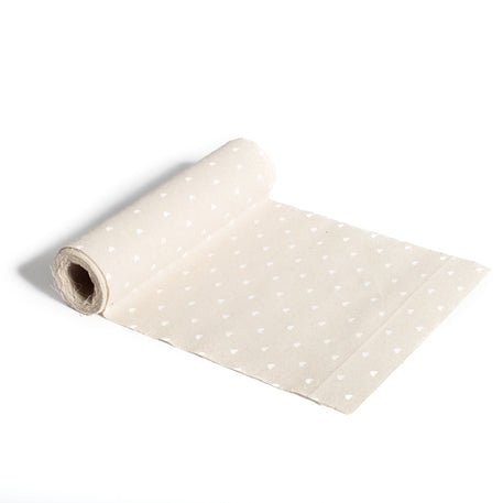 Camino de mesa en color piedra con corazones en blanco. Es ideal para todo tipo de fiestas por su tamaño y calidad. En una fiesta de Bautizo o Primera Comunión el resultado será...¡BRUTAL!