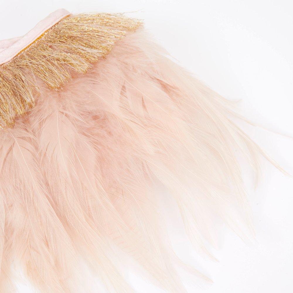 Absolutamente ideal esta capa corta repleta de plumas en color melocotón con cuello y forro en satén blanco. Es ideal para una fiesta con temática invernal o de cisnes o simplemente para conseguir un look fantástico y chic. Es absolutamente adorable y suave.