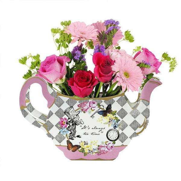 Centro de mesa en forma de tetera con diseño de la colección Alice de Talking Table.