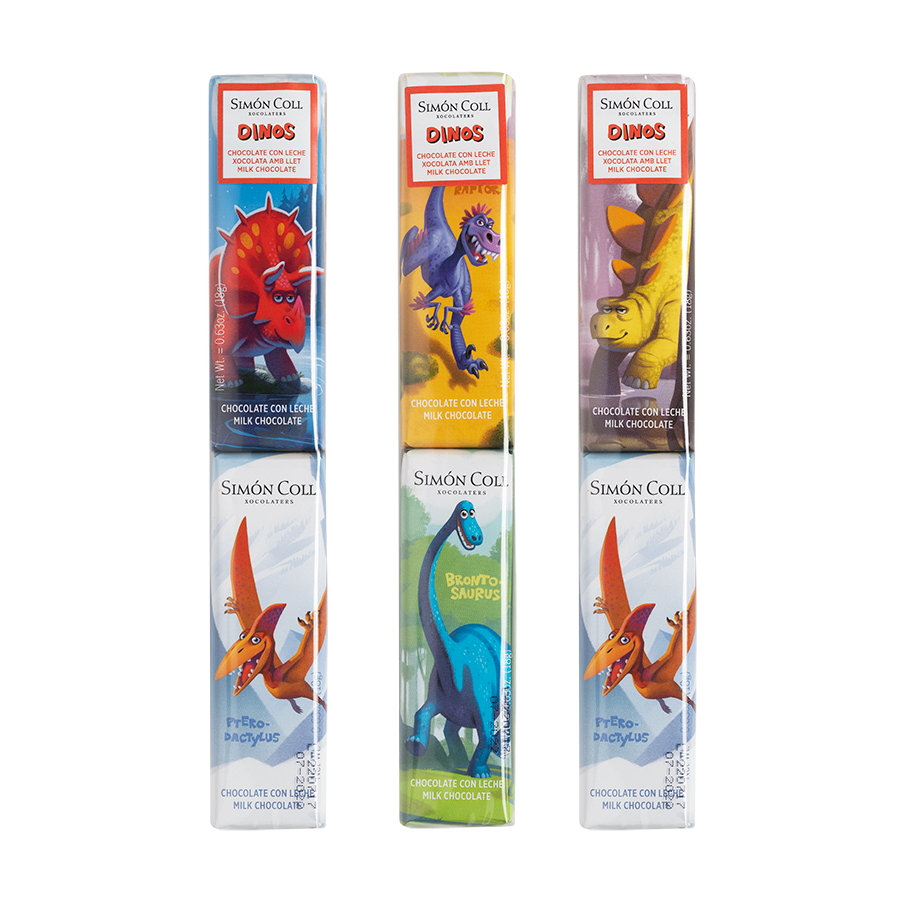 Ideales chocolatinas de 18 gr. de chocolate con leche para los más pequeños con ilustraciones de dinosaurios Perfectas para poner en un candy bar o para detallito a cada niño en cumpleaños.