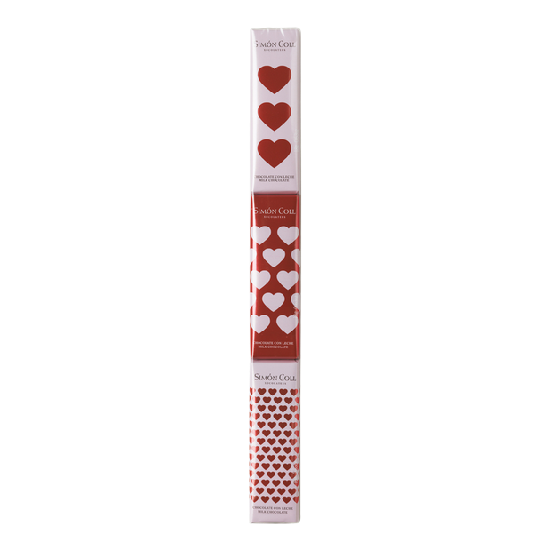 Recibirás un estuche con 3 tabletas de 18 grs. cada una y diseños de corazones en rojo y rosa.