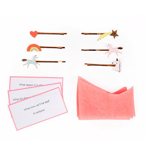 Cada uno contiene un precioso clip dorado con figura esmaltada para el pelo, una corona de papel y una broma en inglés.
