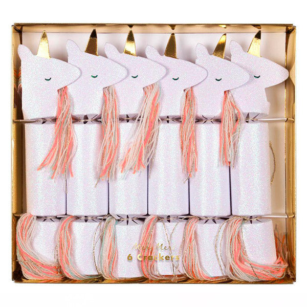 ¡Absolutamente ideales! Regala estos preciosos Crackers con forma de unicornios brillantes de purpurina iridiscente y decorados a tus invitados en tu fiesta.