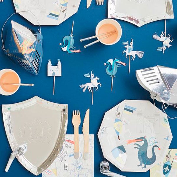 Con este set tendrás todo lo que necesitas para decorar tus Cupcakes en una fiesta de Caballeros, con caballos, espadas y dragones.