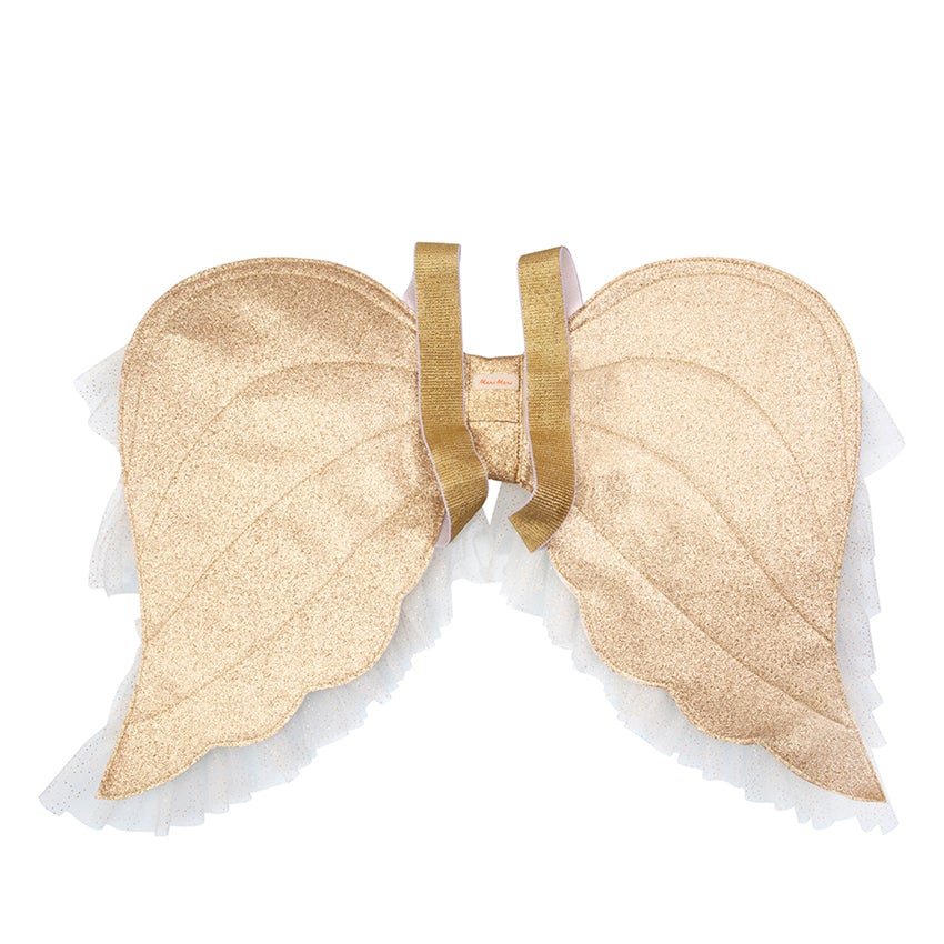Absolutamente ideales estas alas de tul con mini topos dorados de ángel con tirara de estrellas en dorado glitter. El interior viene forrado con una tela dorada con glitter. Es ideal para las fiestas navideñas.