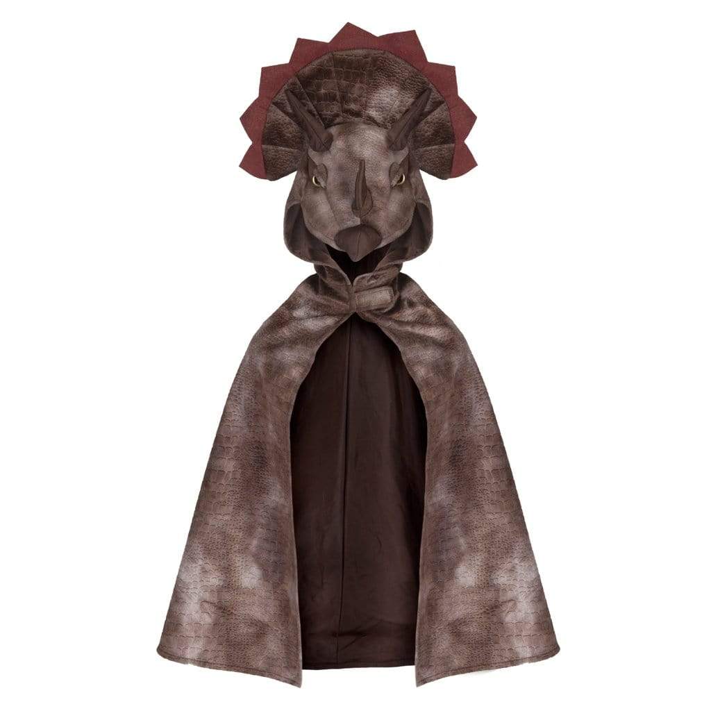 ¡¡ROOOOOAAARRR!! Este genial disfraz tipo capa con capucha de un fantástico Triceratops en color marrón es brutal. Realizada en terciopelo texturizado de color marrón, con unos ojos muy realistas y detalles de relleno en 3D. Está forrada y tiene un cierre en velcro que la hace duradera para todo tipo de aventuras jurásicas.