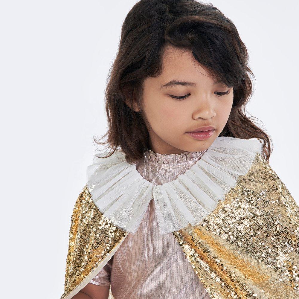 Esta hermosa capa dorada es una manera fabulosa de lucir espectacular en cualquier fiesta o celebración. También es ideal para tener en tu baúl de disfraces. Está elaborada con tela de lentejuelas dorada forrada y con cuello de tul blanco. Viene con una varita de estrella de lentejuelas doradas, perfecta para agitar majestuosamente.