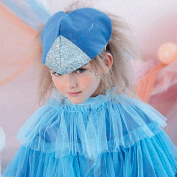 Absolutamente ideal este disfraz de pavo real azul tipo capa de tul con tocado de terciopelo, algodón y glitter dorado para niños y niñas. Tanto el tocado como la capa disponen de una cinta ajustable.