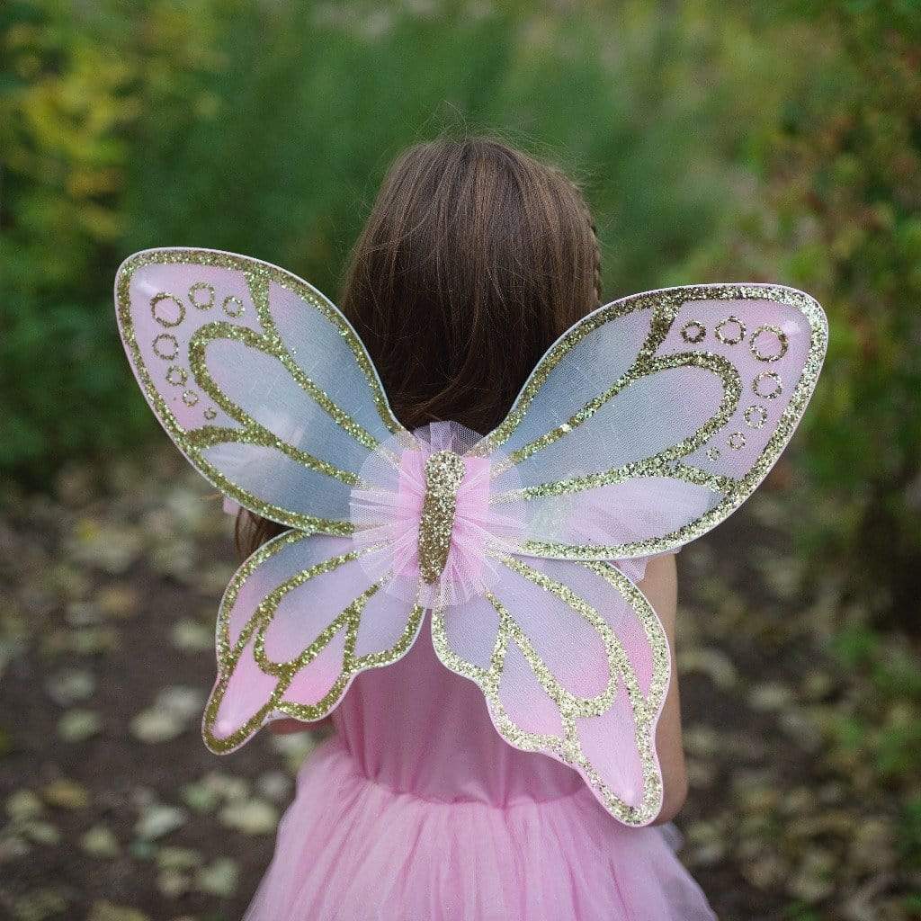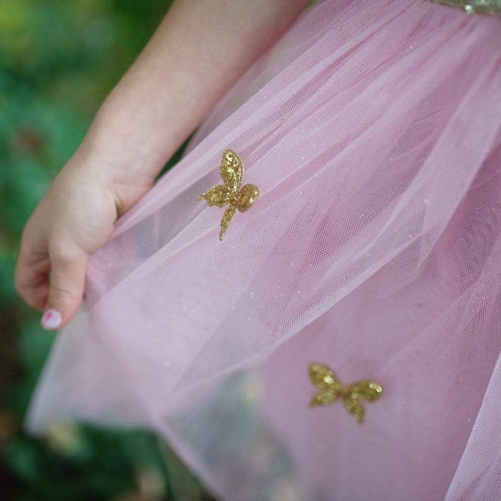 Absolutamente ideal este disfraz rosa de tul con alas de mariposa con detalles dorados y pequeñas mariposas en la falda. Combinado con una parte de arriba llena de lentejuelas doradas muy brillantes. Perfecto para tener en la caja de disfraces, para una fiesta de disfraces o un momento especial.