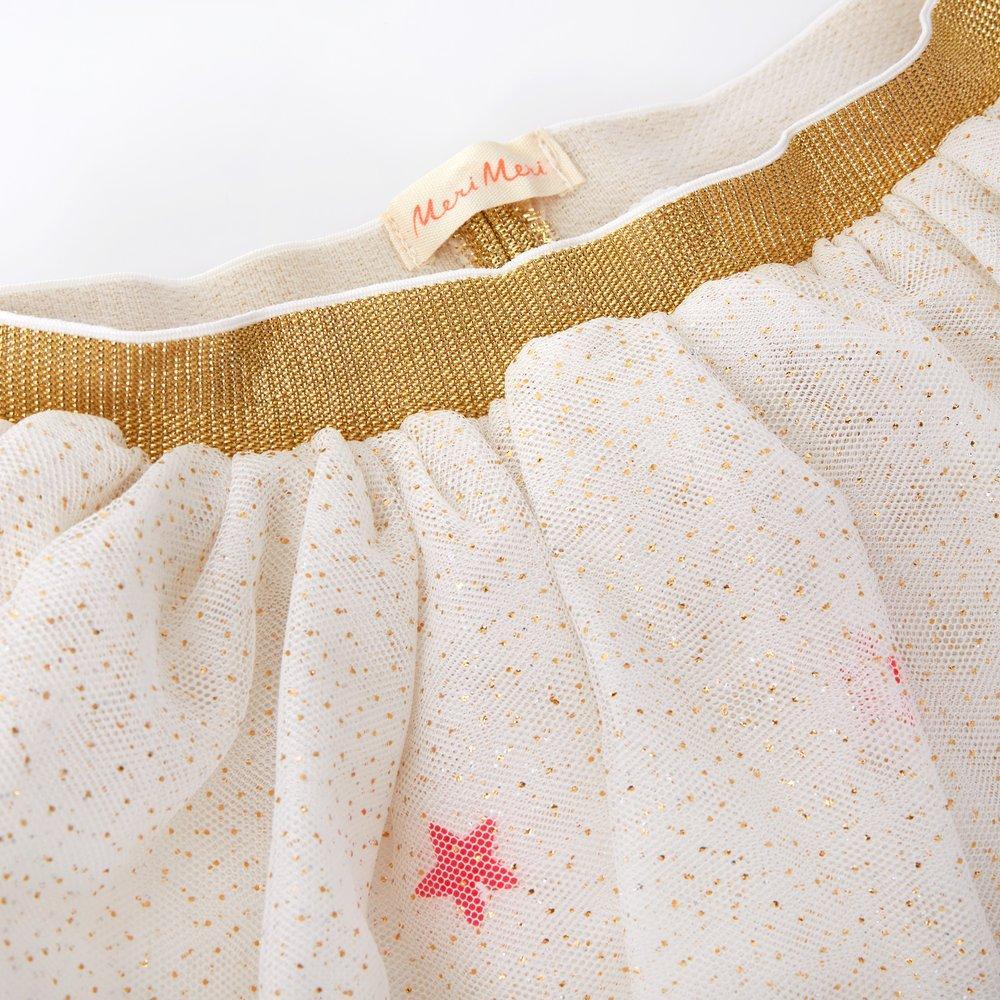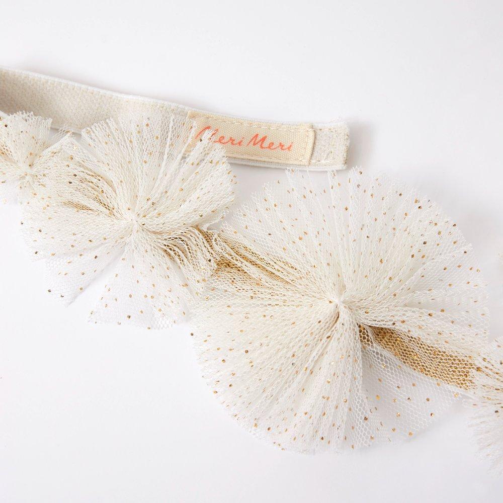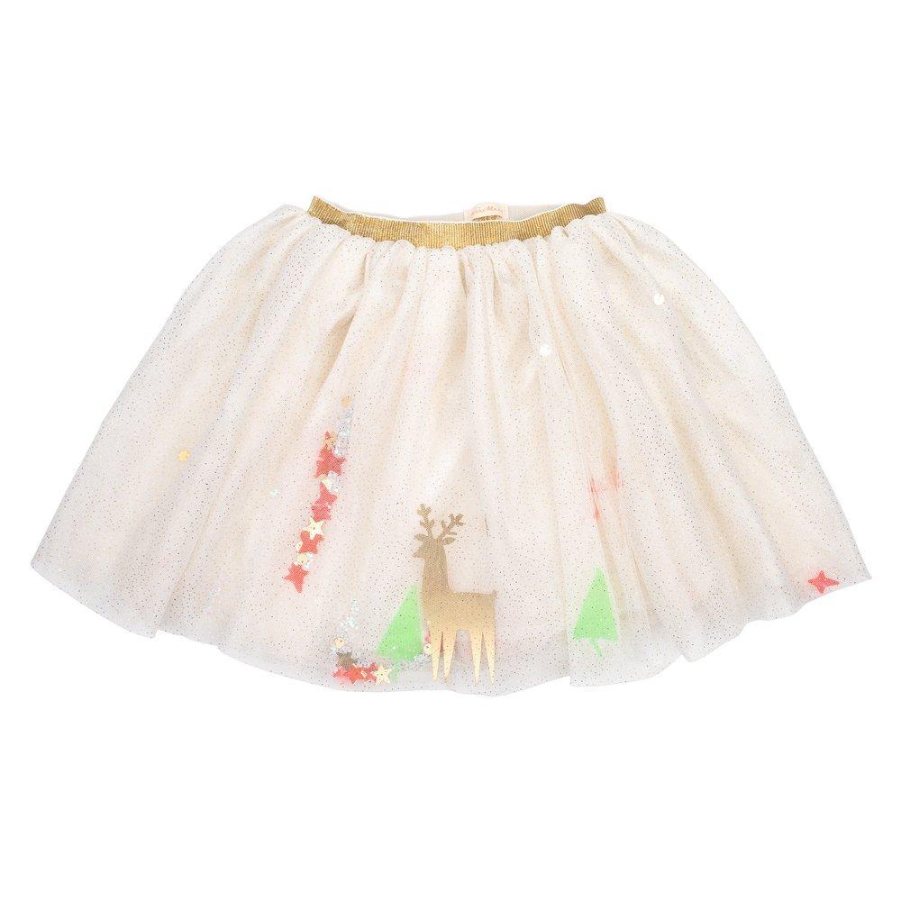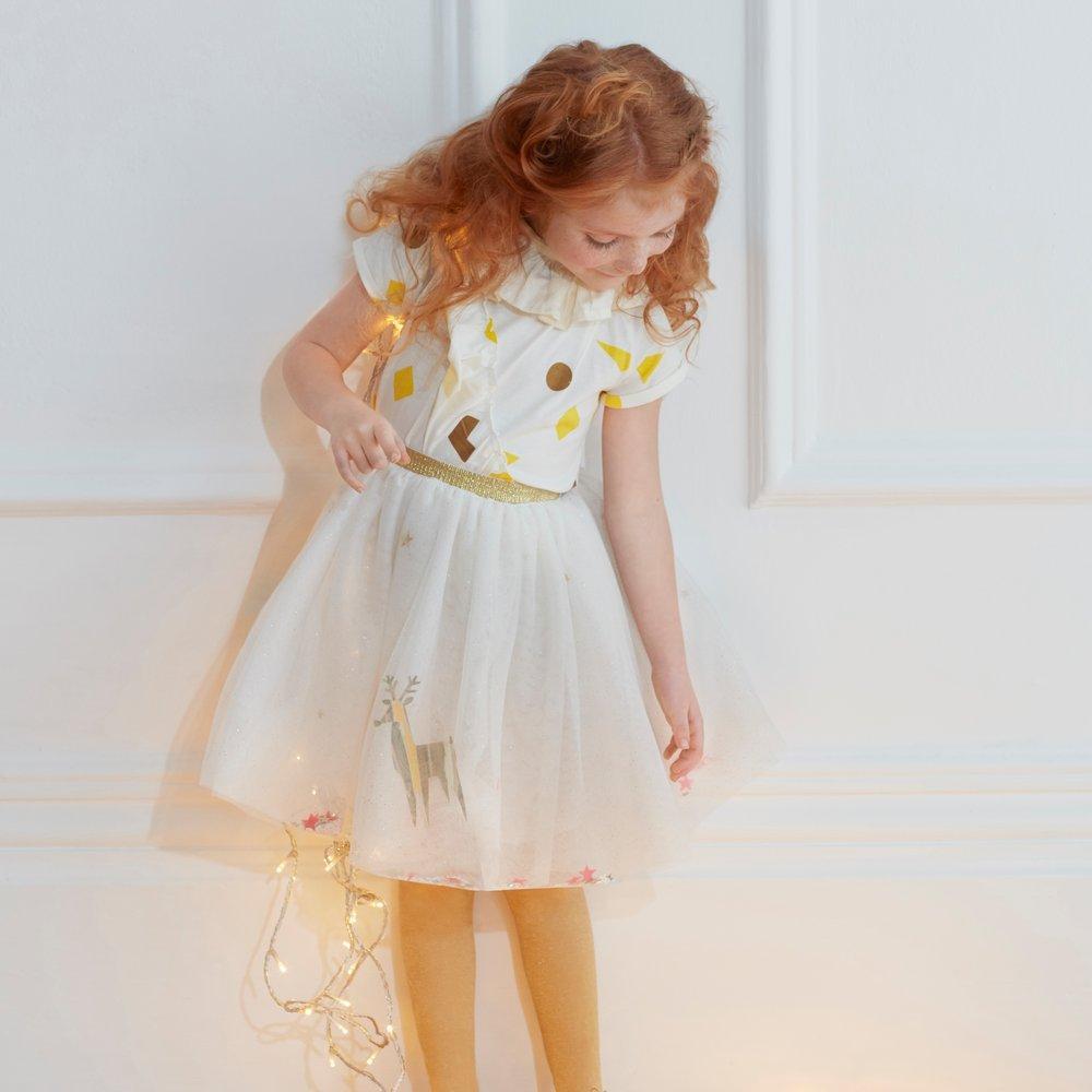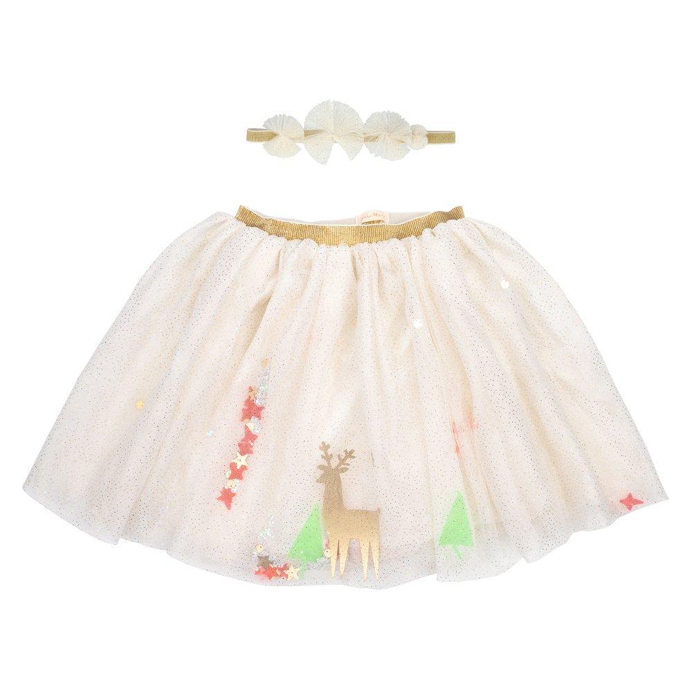 Absolutamente ideal es esta falda de tul blanca con detalles dorado y con estrellas, arboles de navidad y un gran reno por dentro de la falda, que se mueven con el movimiento. Además lleva una diadema a juego de pompones de tul preciosa.