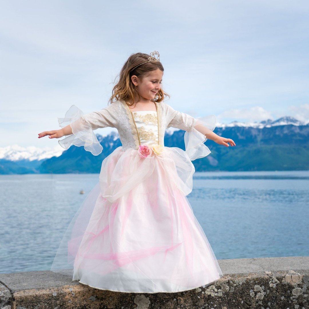 Disfraz de princesa clásica en color rosa y beige adornado con unas bonitas flores en el cuerpo. El corpiño está realizado en terciopelo y con detalle de encaje en dorado. En la falda tiene un aro para no perder la forma y una capa superior de tela brillante. Perfecto para tener en la caja de disfraces, para una fiesta de disfraces o un momento especial.