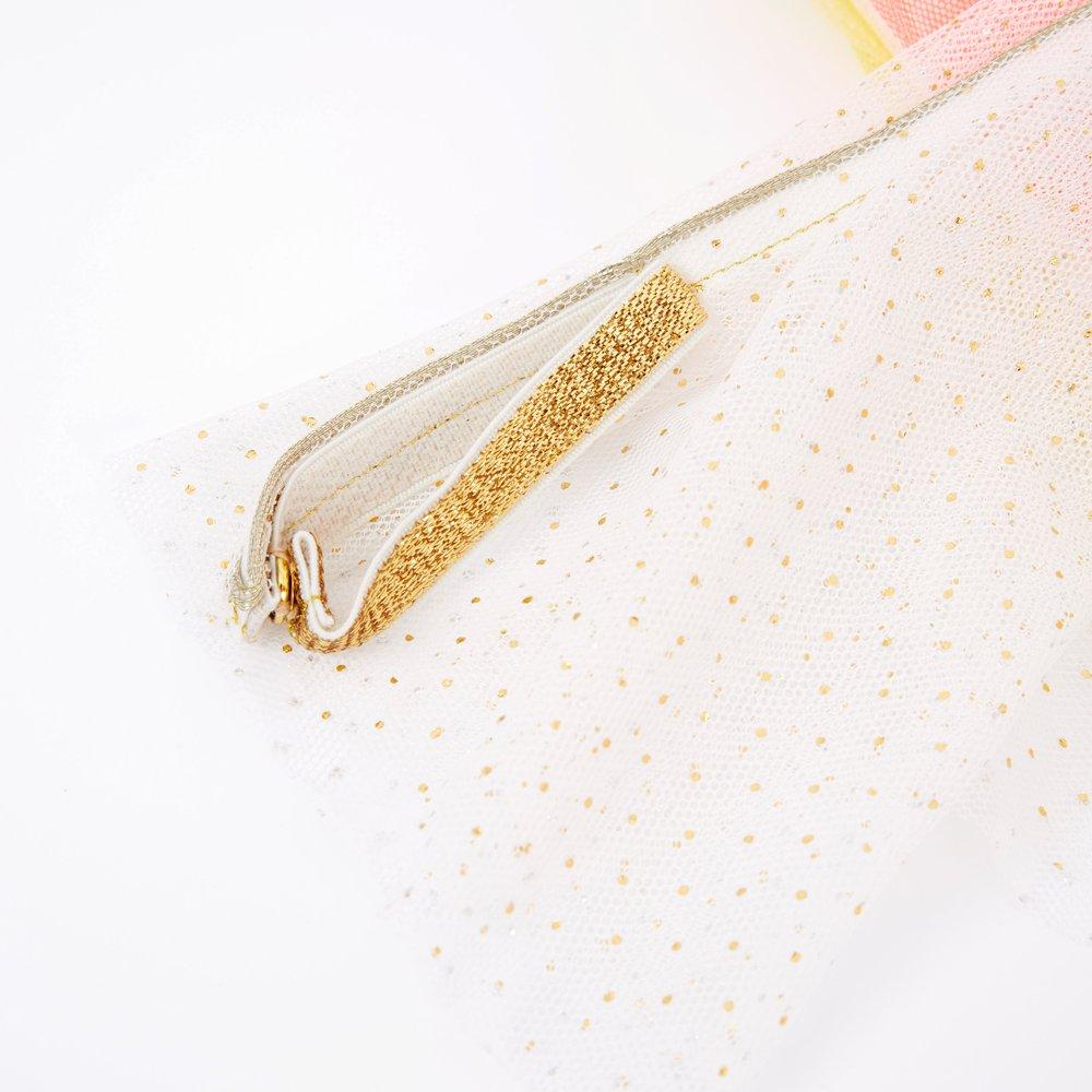 Absolutamente ideal este disfraz de hada del arcoíris en tul de colores con forro de polialgodon con detalles dorados, alas de tul con borde dorado y varita de sol sonriente para lanzar hechizos mágicos. Los tirantes son ajustables y las alas pueden quitarse del vestido.