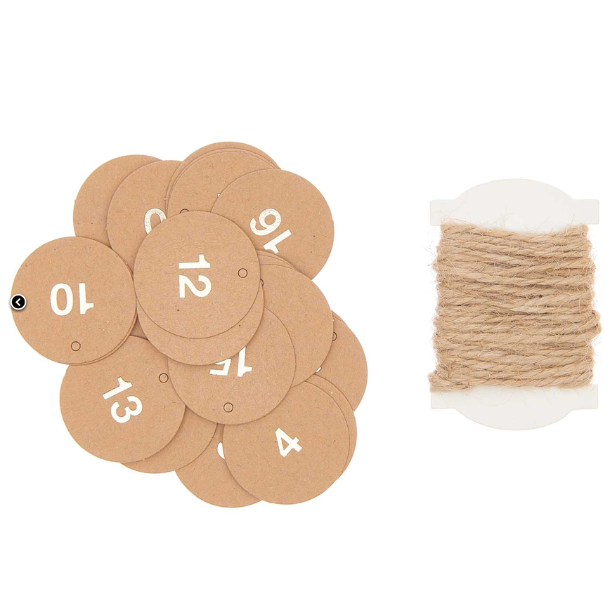 Etiquetas de cartón en acabado Kraft y cuerda yute para colgarlas.