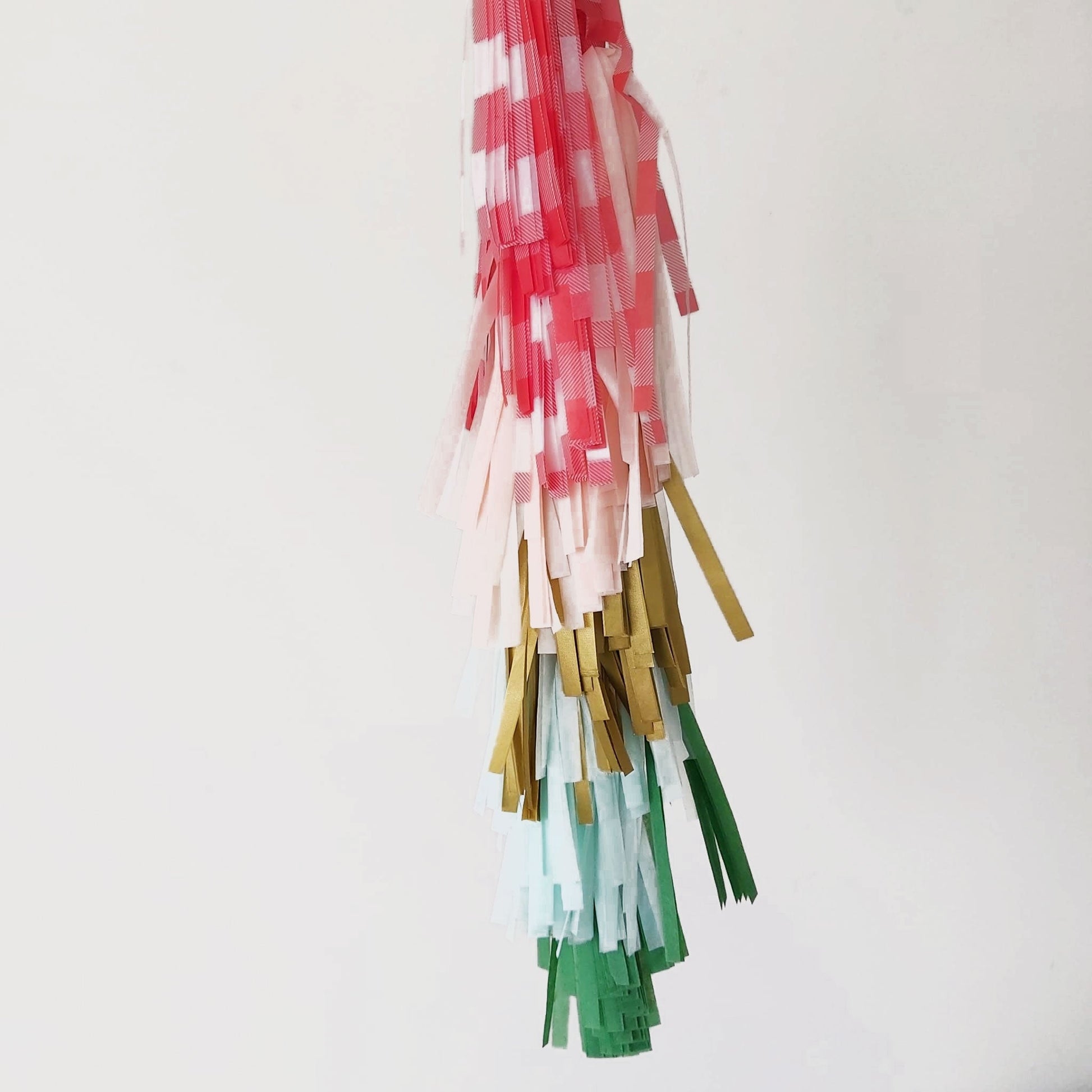 - Decoración con guirnalda cosida a mano de papel de seda. Al ser un producto realizado a mano, el resultado final puede variar de la imagen.