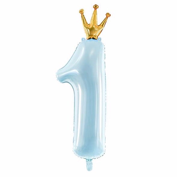 Globo en forma de número 1 en color celeste con detalle de corona en color dorado. Perfecto para las fiestas de los mas pequeños con temática primer cumpleaños.