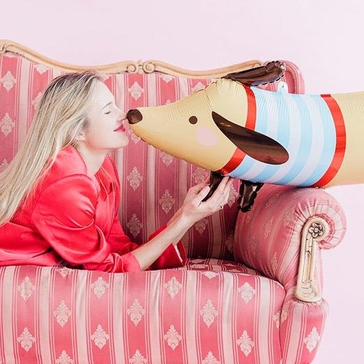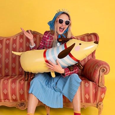 Globo en forma de perro Dachshund con un gracioso jersey de rayas. Perfecto para las fiestas de los mas pequeños amantes de los animales.