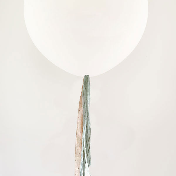 1 Decoración con retales de cintas de tela PLUMETI mint y piedra. Las cintas de un globo L miden 50 cm. de largo y este kit contempla 4 cintas colgando. El tamaño y cantidad de las cintas está calculado para resistir el peso de un globo hinchado con helio
