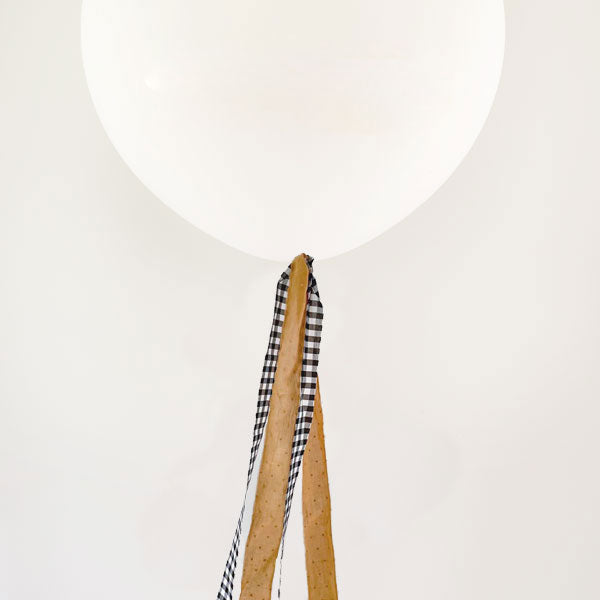 1 Decoración con retales de cintas de tela Vichy negro y mostaza plumeti. Las cintas de un globo L miden 50 cm. de largo y este kit contempla 4 cintas colgando. El tamaño y cantidad de las cintas está calculado para resistir el peso de un globo hinchado con helio