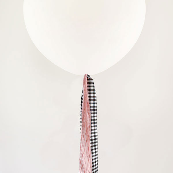 1 Decoración con retales de cintas de tela Vichy negro y rosa plumeti. Las cintas de un globo L miden 50 cm. de largo y este kit contempla 4 cintas colgando. El tamaño y cantidad de las cintas está calculado para resistir el peso de un globo hinchado con helio