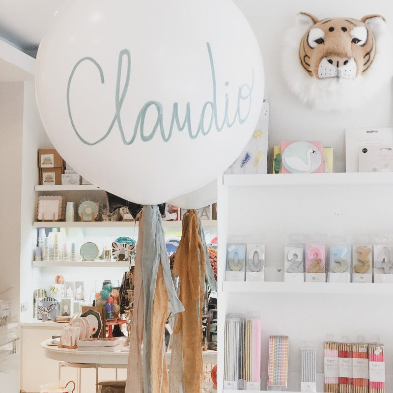 Globo L Látex Bio blanco hinchado con telas mint, piedra, mostaza y Lettering <br> (solo Barcelona)</br>