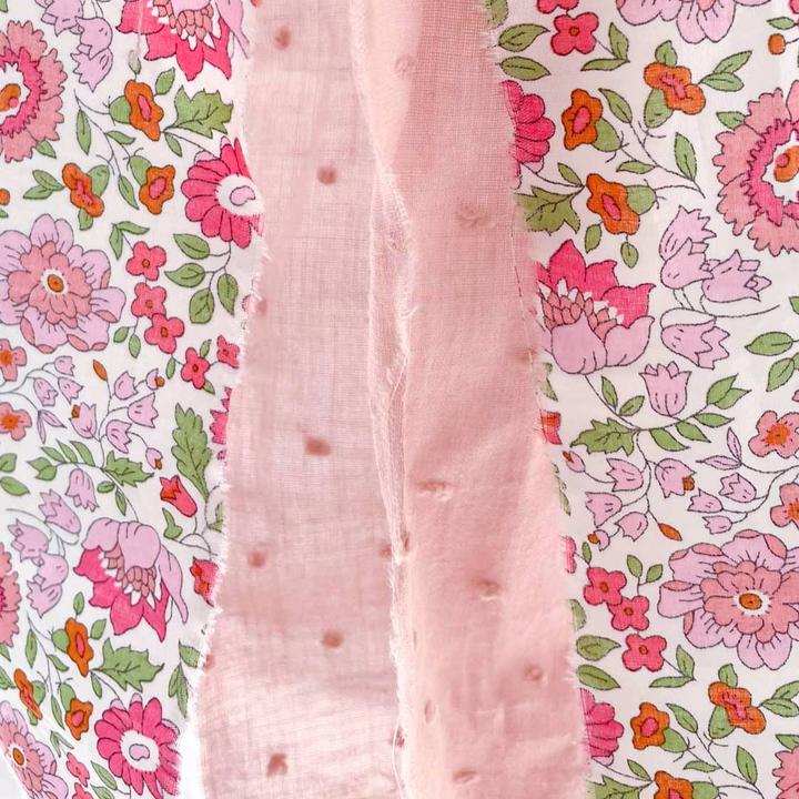 - Decoración con retales de cintas de tela en rosa plumeti y Liberty rosa. Al ser un producto realizado a mano, el resultado final puede variar de la imagen.