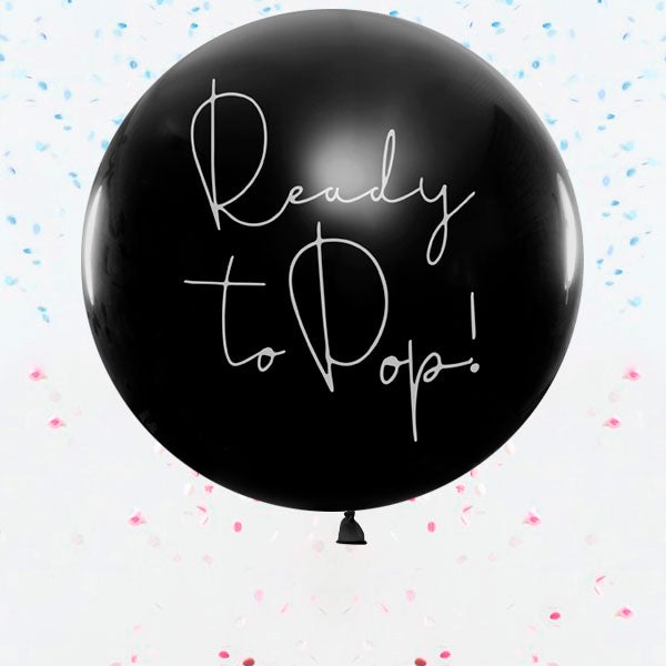 - Globo negro de 1m de diámetro con serigrafía "Ready to pop" relleno de confeti en azul o rosa dentro e hinchado con helio.
