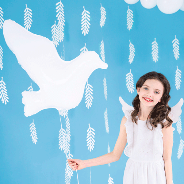 Globo Foil en forma de paloma blanca, ideal para decorar la mesa dulce en la primera comunión. Puedes hincharlo con Helio o con aire. Puede flotar en tu fiesta, colgar del techo o pegarlos en una pared... el efecto es total!