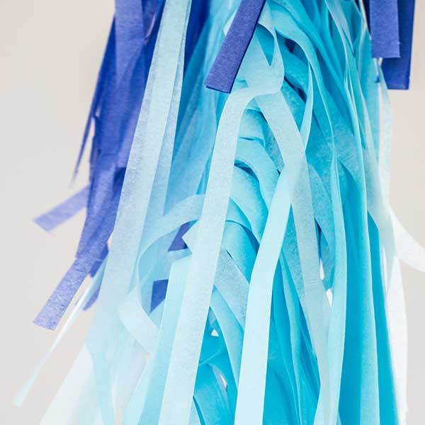 1 Guirnalda de flecos BLUE en papel de seda cosida a mano a una cinta de tela para que puedas cogerla tu globo de forma fácil y rápida. Medidas 70 x 25 cm.