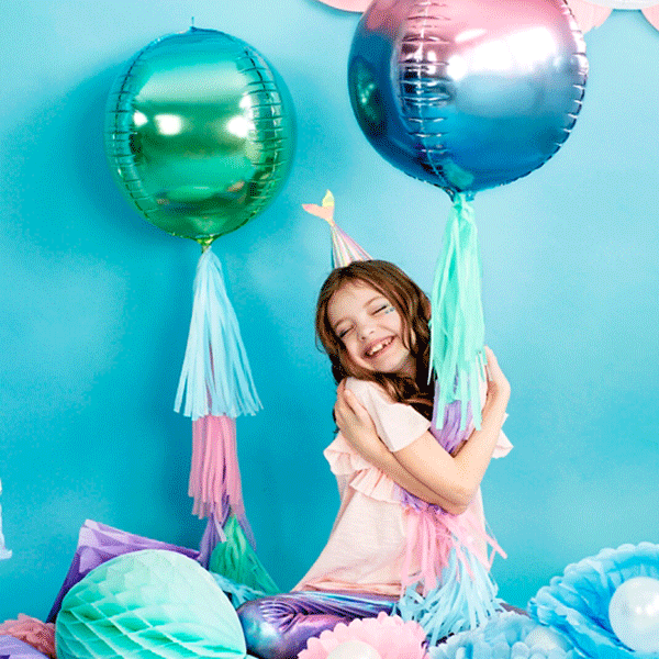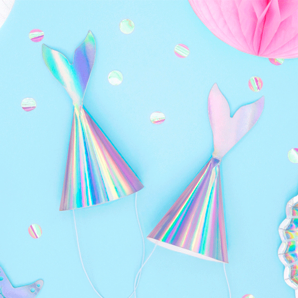 Simpáticos gorritos de fiesta iridiscentes con forma de cola de sirena. Llevan una goma para ajustarlos a la cabecita de los niños.