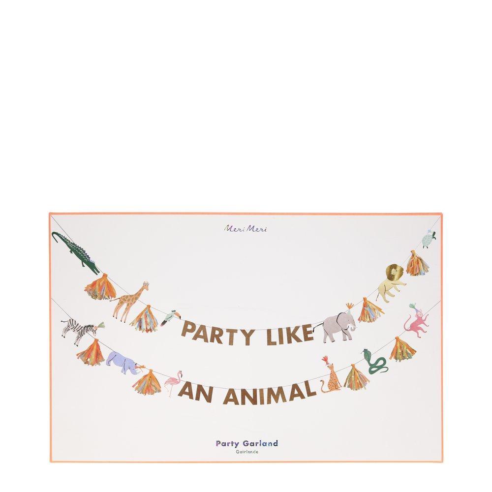 Jirafas, zebras, elegantes y serpientes...¡no falta nadie! Guirnalda con ilustraciones de animales safari y pompones de colores, ideal para decorar tu mesa dulce o la entrada a la tu fiesta. Puedes combinarlo con detalles básicos para darle mayor protagonismo.
