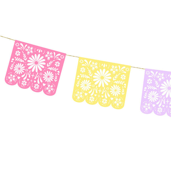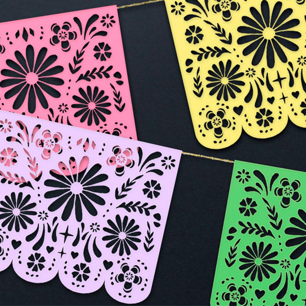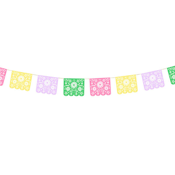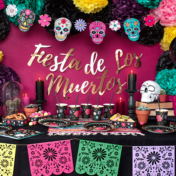 Guirnalda de banderines cuadrados de papel troquelado con estampado típico mejicano, ideal para decorar tu fiesta de Halloween día de los Muertos.