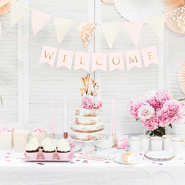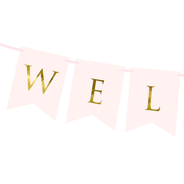 Bonita y delicada guirnalda en rosa palo con letras de Welcome en dorado brillante. Es muy elegante y ideal para recibir a tus invitados a tu fiesta.